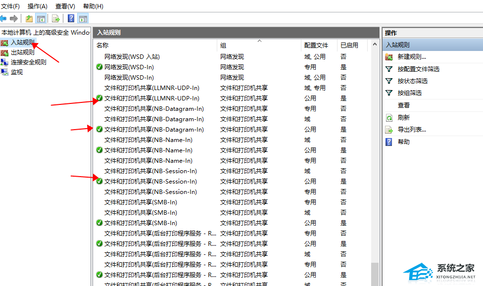 3. 点击高级设置,检查进站出站是否允许文件和共享打印选项,前面绿色代表允许进站或出站。