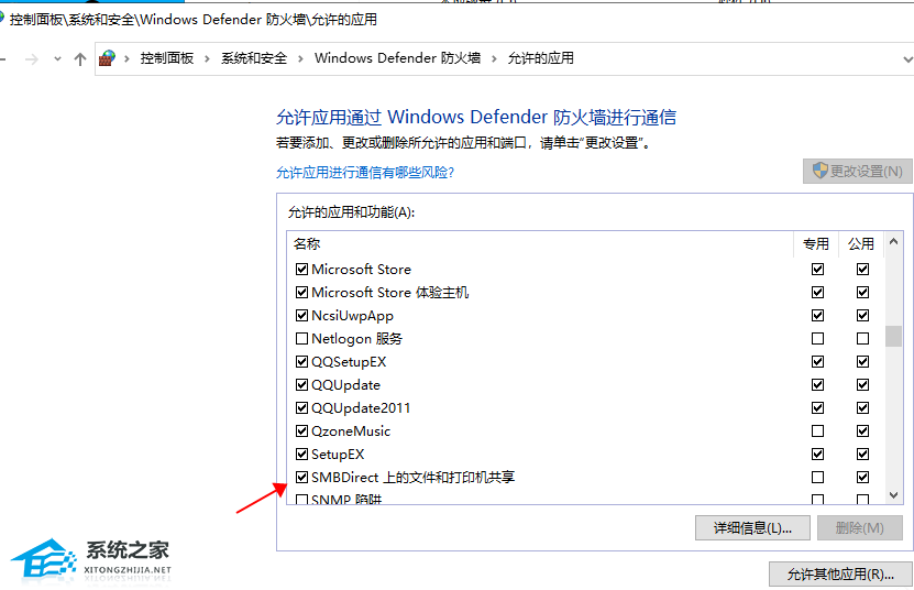 2. 点击允许应用或功能通过WindowsDefender防火墙,若没勾选,需勾选,点击确定。