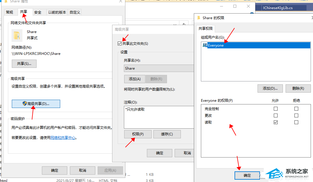5. 设置需要共享的文件,右键>共享>高级共享>共享此文件夹,接着点击权限>Everyone>只读 ,点击确定保存即可。