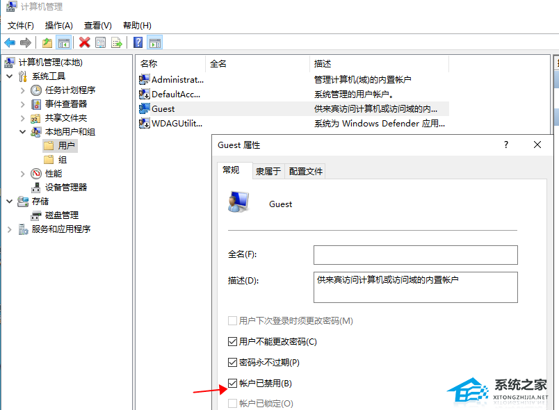 4. 若此时还无法访问共享文件,查看是否配置Guest用户设置,计算机>右键>管理>计算机管理>系统工具>本地用户和组,选择右边,Guest,右键属性,把账户已禁用选项前面勾去掉,点击确定。