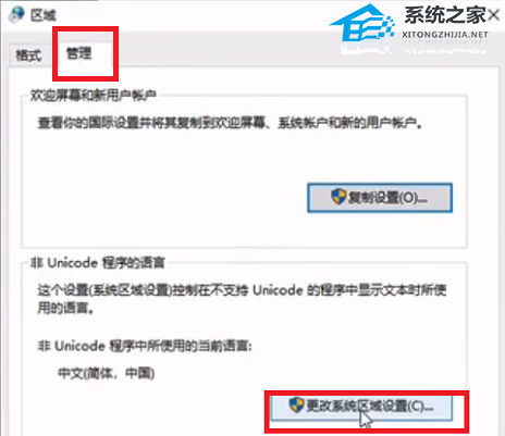 4. 找到“管理”按钮,点击“更改系统区域设置”。