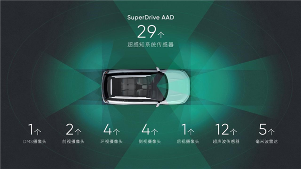 所谓的“可成长”即是能自由选择升级硬件,据官方介绍,从2023年第三季度开始,用户可以选择付费升级到SuperDrive AAD系统,SuperDrive AAD系统搭载29个超感知系统传感器,在此系统下,自游家支持包括高速 / 城市 NOA 和更多场景下的自动泊车功能。