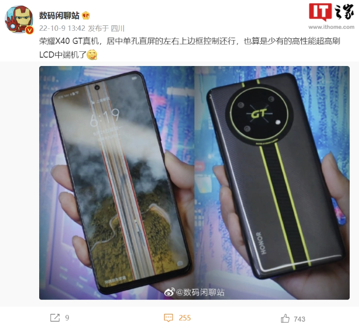 另据数码博主 @数码闲聊站 曝光的真机照,荣耀 X40 GT 采用居中单孔直屏,左右上边框控制较好,爆料称该机“算是少有的高性能超高刷 LCD 中端机了”。