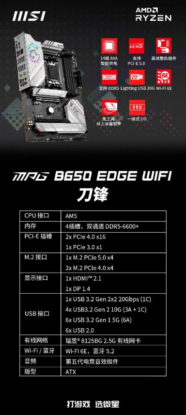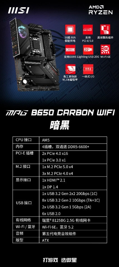 此外微星本次发布的三款 MPG 系列 B650 主板:ATX 板型的 MPG B650 CARBON WIFI 暗黑、MPG B650 EDGE WIFI 刀锋以及 ITX 板型的 MPG B650I EDGE WIFI 刀锋也将陆续上市。