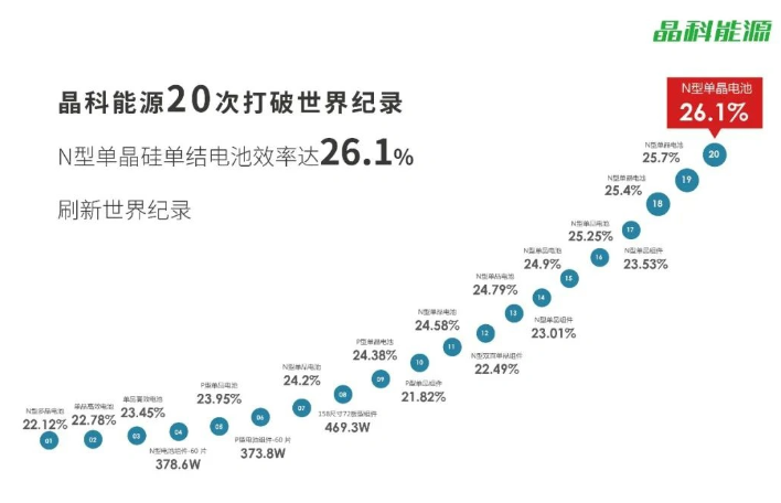 据晶科能源介绍,通过坚持不懈地技术攻关,研发团队率先开发出界面缺陷修复、高透多晶硅膜以及激光 SE 基础的超细金属电极等多项适用于大尺寸的先进技术,以及自主开发的成套 HOT 高效电池工艺技术等多项创新及材料优化,实现 26.1% 的转换效率,再次突破今年 4 月创造的 25.7% 的转换效率。