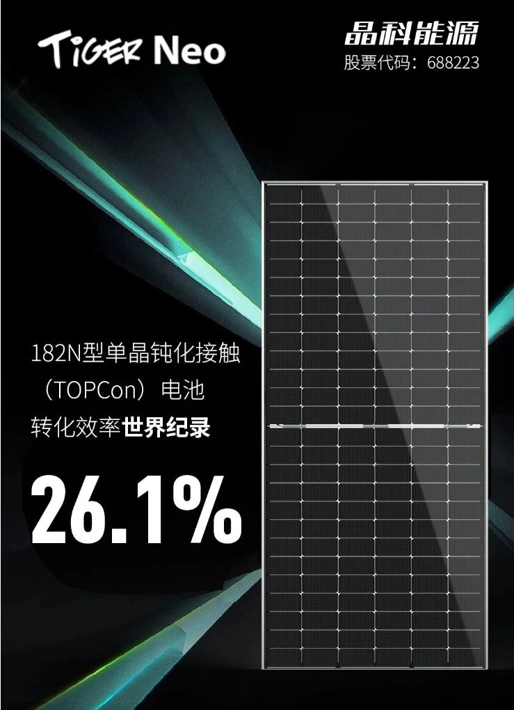 10 月 17 日消息,据晶科能源官方公众号消息,日前晶科能源宣布,其研究院自主研发的 182 N 型高效单晶硅电池技术取得重大突破,经权威第三方测试认证机构中国计量科学院检测实验室认证,全面积电池转化效率达到 26.1%,又一次创造了 182 及以上尺寸大面积 N 型单晶钝化接触(TOPCon)电池转化效率新的世界纪录。