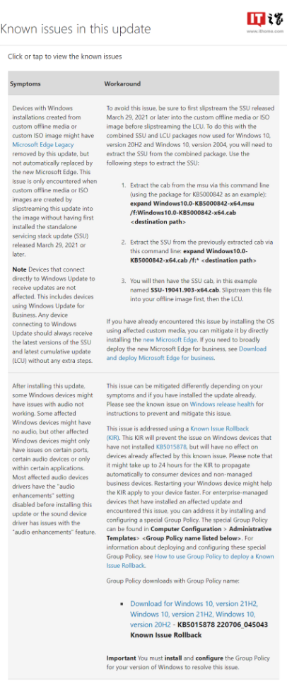 安装此更新后,一些 Windows 设备可能有音频不工作问题。一些受影响的 Windows 设备可能没有音频,但其他受影响的 Windows 设备可能只在某些端口、某些音频设备或只在某些应用程序中出现问题。大多数受影响的音频设备驱动程序在安装此更新前禁用了“音频增强”设置,或者声音设备驱动程序的“音频增强”功能有问题。
