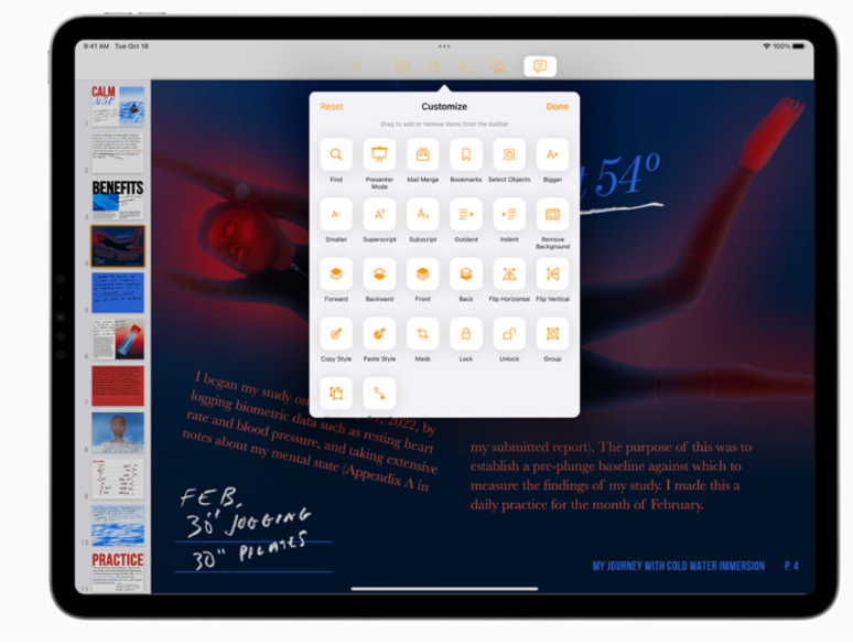桌面级 App 带来一系列针对 iPad Pro 显示屏优化的新功能,通过新元素和崭新的交互模式令 App 变得更强大,包括全系统通用的撤销和重做、经过重新设计的查找和替换体验、新版文档菜单、可自定义的工具栏、更改文件扩展名和在文件 App 中查看文件夹大小的功能等。