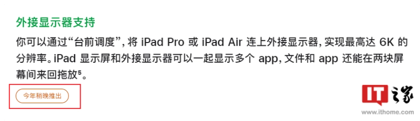 台前调度的外接显示器支持将无法在 10 月 25 日上线,官方称“今年稍晚推出”,支持分辨率最高可达 6K,便于用户以理想的方式组织工作空间,在 iPad 和外接显示器上同时各自运行最多可达 4 个 App。