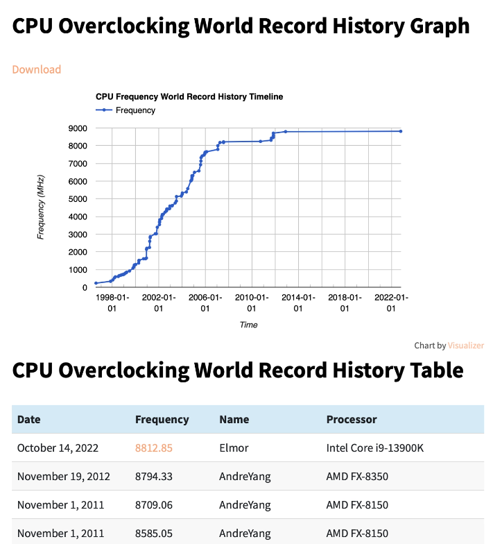 据 skatterbencher 数据,上一次出现接近 8.8GHz 还是在 2012 年,AMD FX-8350 创造了 8794.33MHz 的频率。