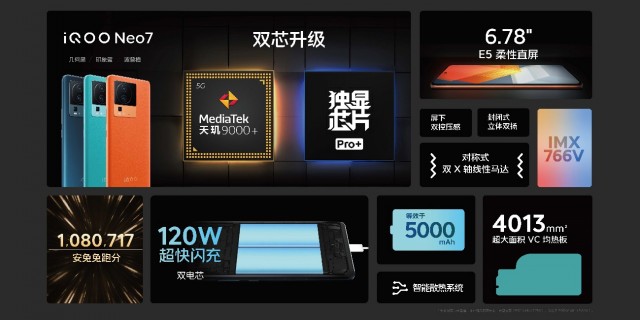 2022年10月20日,“硬核双芯 热血酷玩”iQOO Neo7正式发布,搭载经过悉心调校的最强旗舰芯之一——天玑9000+,携手独立显示芯片 Pro+,带来超强悍的性能表现,更有全方位顶级配置,是一款诚意满满的越阶之作,也是最为值得购买的游戏性能旗舰之一。