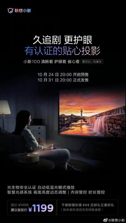 10 月 24 日消息,联想官方宣布,小新 100 智能投影仪 10 月 24 日 20:00 正式开启预售,首发 1199 元。