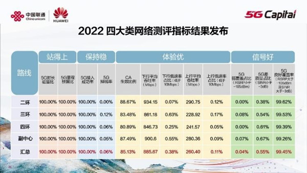 凭借北京联通创新的数字化运营模式以及华为5G创新技术,双方于2022年8月完成了超过3000个站点的200MHz大带宽网络部署,实现了北京城市核心区域的全面覆盖。并于9月底,双方邀请主流媒体代表最终用户对该200MHz网络的主要交通干线、街巷毛细道路进行了四大类“占得上、保持稳、体验优、信号好” 十二项指标的全面测评。其中,此次体验测评引入了CA生效比这一新指标,用于体现200MHz大带宽的CA的连续性表现。测试结果表明,CA生效比达到了85%,5G用户下行峰值速率达到1.8Gbps,下行平均吞吐率达到885.7Mbps,上行峰值速率达到400Mbps,上行平均吞吐率达到260.4Mbps,信号良好覆盖率保持在99%以上。优异的指标表现,完全支撑了在高速车载移动场景下移动办公、移动教育、移动娱乐、以及AR/VR等4项5G典型应用。