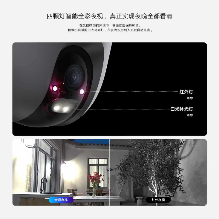 这款摄像头配备了 400 万像素 F1.6 光圈传感器,可实现 2.5K 超清画质,而且支持全彩夜视,采用双云台设计。