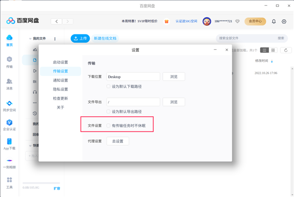不休眠设置:有传输任务时,网盘保持不休眠,保证传输链路完整,便于大文件下载;