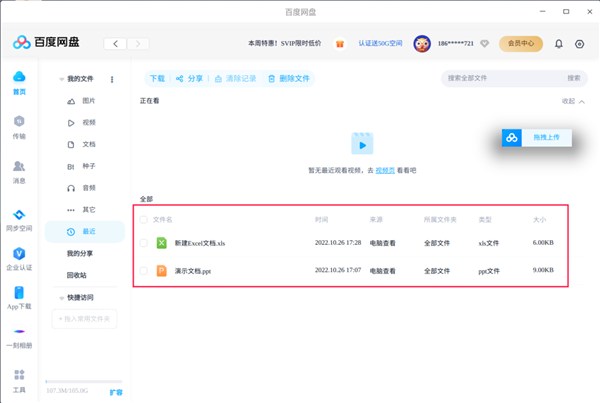 最近访问:在网盘首页“最近”中,可查看最近访问过的文件信息,包括“访问时间、来源、所属文件、文件类型以及文件大小”等信息;