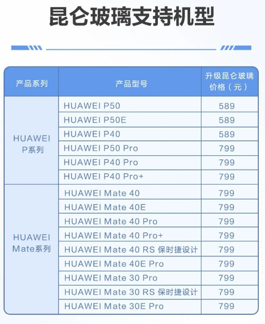 日前,华为终端客户服务官方公布了可升级昆仑玻璃的机型,售价589元起,升级时间为2022年10月30日至2022年12月31日。