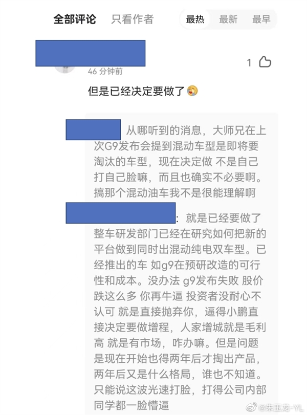 “没办法,G9发布失败,股价跌这么多,你再牛X,投资者没耐心、不认可,就是直接抛弃你,逼得小鹏直接决定要做增程,人家增程就是毛利高就是有市场,咋办嘛。”