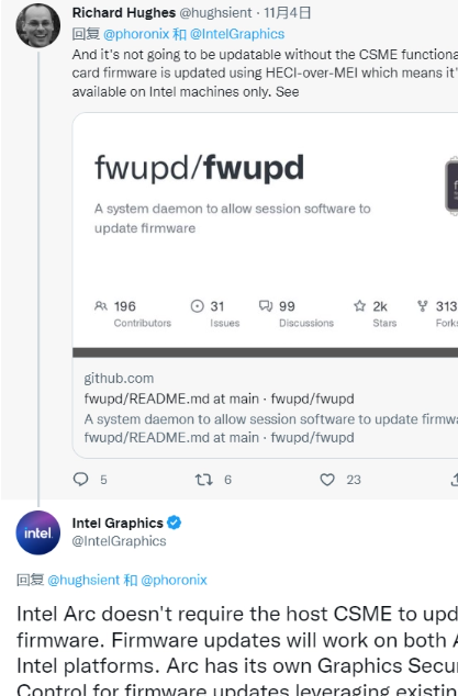 LVFS / Fwupd 首席开发者 Richard Hughes 指出,为 Arc 显卡更新 GSC 固件目前需要 Intel Management Engine (ME) 功能,这相当于限制运行环境,你必须在基于英特尔 CPU 的平台上才能更新显卡固件。