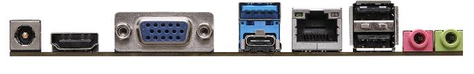 后置接口方面,这款主板搭载了 19V DC 供电接口,HDMI 接口、VGA 接口、USB-C 和 USB-A 接口、RJ-45 网口和音频接口。