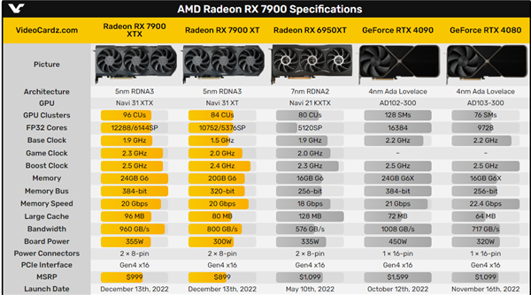 AMD指出,从流处理器规模、显存容量/位宽、浮点算力等纸面参数上,RX 7900 XT/XTX都在RTX 4080之上,而且AMD新卡还首发支持DP2.1接口,更重要的是,<>最贵的7900 XTX不过999美元(国行7999元),远比RTX 4080的1199美元(国行12999元)便宜。