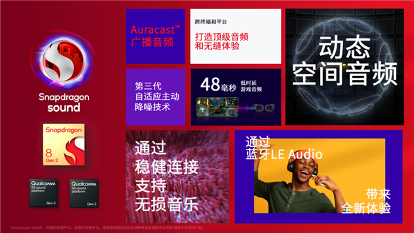 两款全新平台还支持第三代高通自适应主动降噪(ANC)技术,通过对入耳贴合度和用户外部环境的适应来提升听感体验。实现对全新蓝牙LE Audio规范中无损音频的支持。