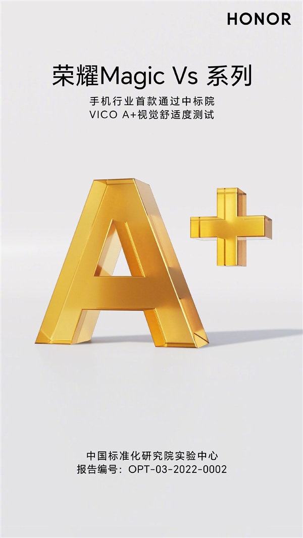 荣耀CEO赵明今日表示,荣耀Magic Vs是荣耀健康显示技术的又一里程碑,该机是行业首款通过中标院VICO A+视觉度舒适测试的产品。