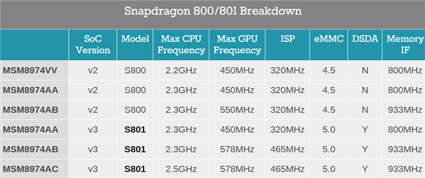 SM8974AB版本的GPU、ISP频率分别提高到578MHz、465MHz,SM8974AC版本则进一步将CPU频率提高到2.5GHz。