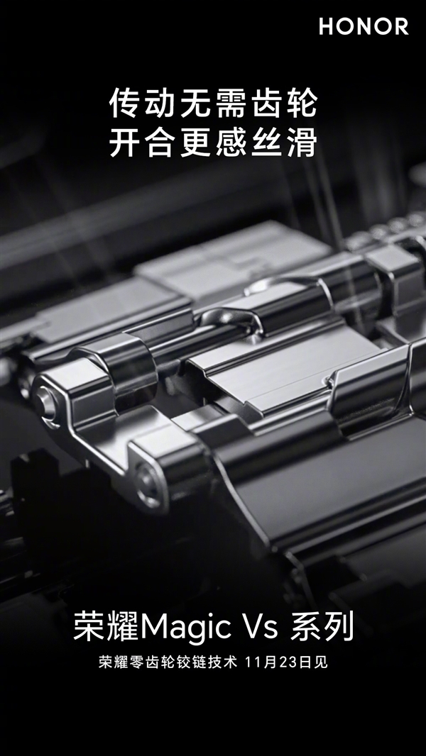 荣耀今日公布,荣耀Magic Vs在铰链上进行升级,搭载了全新零齿轮铰链技术,较上一代的悬浮水滴型铰链,新机在开合时更加丝滑,且机身厚度更加轻薄。