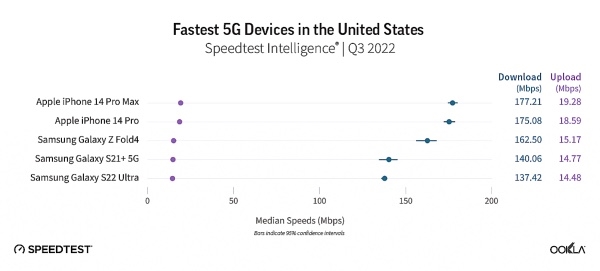 北京时间11月22日下午消息,Ookla通过Speedtest Intelligence统计了2022年第三季度联网移动终端数量最多的10个国家的5G性能,研究了给定国家中五款最快的流行5G终端。