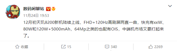 据最新爆料,12月初天玑8200的新机就会陆续上线,各种配置都有,曲面屏、直屏;80W、120W;6400万像素的OIS主摄等等,种类繁多。