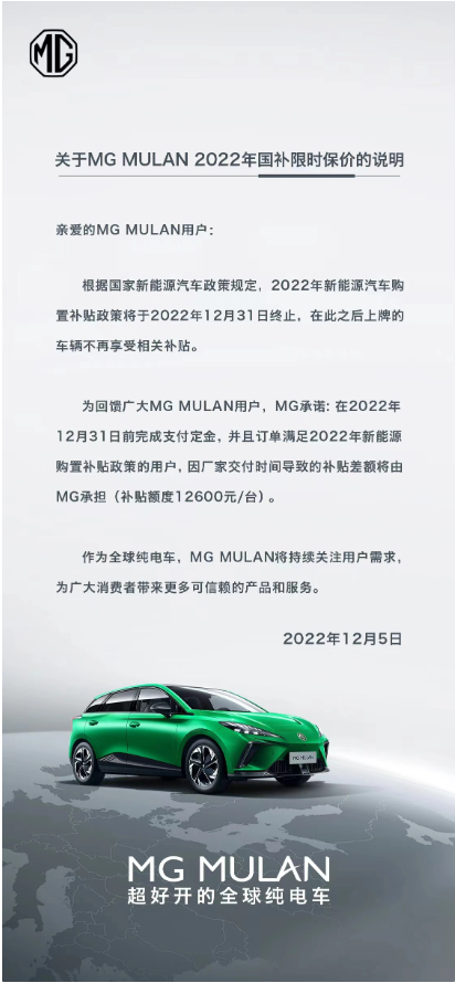 MG 名爵汽车官方表示,为回馈广大 MGMULAN 用户,MG 承诺在 2022 年 12 月 31 日前完成支付定金,并且订单满足 2022 年新能源购置补贴政策的用户,因厂家交付时间导致的补贴差额将由 MG 承担(补贴额度 12600 元 / 台)。