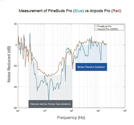 PINE64 表示,PineBuds Pro 每个耳机都配备了 3 个驱动单元,在 50-200 Hz 之间最高 45 分贝的混合自适应主动降噪(ANC),在 150Hz 时最大能提供 55 分贝的降噪。IT之家了解到,该公司不仅声称 PineBuds Pro 是 "最先进的主动降噪无线耳机",而且还提供了一张图表,证明该耳机比 AirPods Pro 2 优秀。
