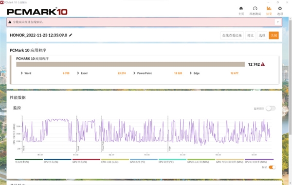 PCMark 10应用程序性能测试,通过运行Office与Edge脚本来模拟PC日常使用,并测试这些应用场景的性能表现,对处理器的单线程、多线程性能都有一定要求。搭载酷睿i5-12500H的荣耀MagicBook V14的整机综合分数为12742。