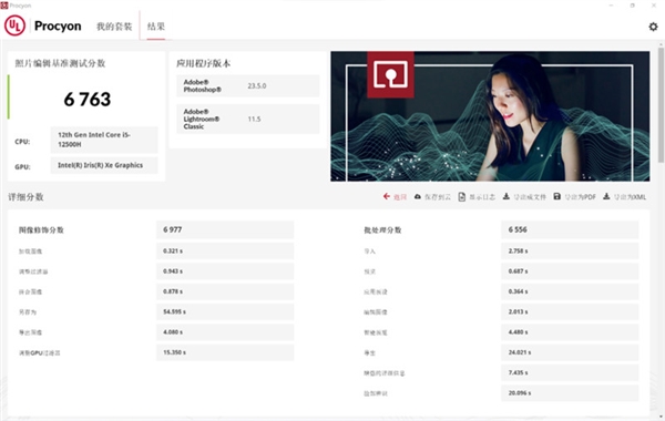 其中照片编辑基准测试使用Adobe Lightroom来导入、处理和修改选定的图像,并使用Adobe Photoshop进行图像编辑与图层调整。搭载酷睿i5-12500H、并集成锐炬Xe核显的荣耀MagicBook V14此项目得分为6763。