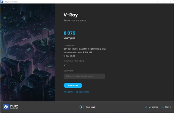 V-Ray是由专业的渲染器开发公司CHAOSGROUP开发的渲染软件,是业界最受欢迎的渲染引擎之一。使用5.0版Benchmark进行测试,搭载酷睿i5-12500H的荣耀MagicBook V14的得分为8075vsamples,酷睿i5-1235U、酷睿i5-1240P等U、P系列处理器有很大优势。