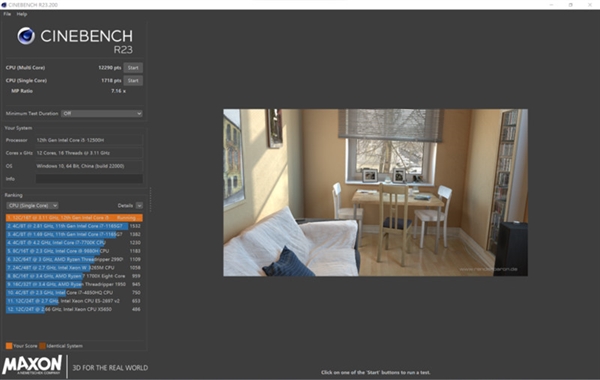 最新的R23版本测试,单核得分为1718pts、多核得分为12290pts。可以说在Cinebench系列测试中,对比搭载酷睿i5-1235U、酷睿i5-1240P等U、P系列处理器的轻薄本机型,45W的酷睿i5-12500H的多线程分数有较大优势。