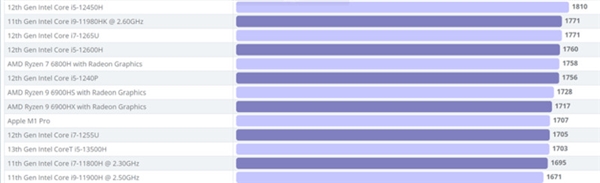 与CrossMark官网数据库的成绩进行对比,可以发现相对于第12代酷睿U系列P系列轻薄本,以及第11代酷睿H系列标压,45W的酷睿i5-12500H也都有一定优势。
