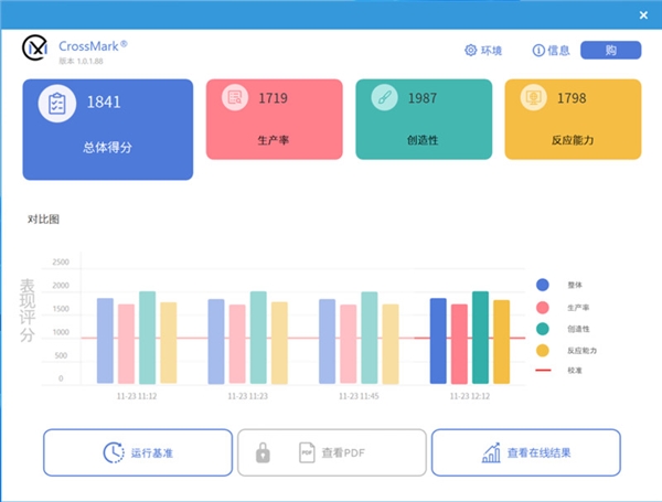 CrossMark则是一款跨平台处理器测试软件,包含生产率、创造性和反应能力三个部分,搭载酷睿i5-12500H的荣耀MagicBook V14的总体得分为1841,来看子项目,生产率得分为1719、创造性得分为1987、反应能力得分为1798。