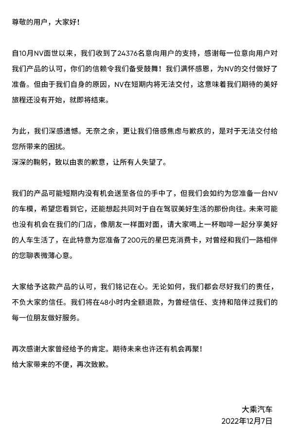 自 10 月 NV 面世以来,我们收到了 24376 名意向用户的支持,感谢每一位意向用户对我们产品的认可,你们的信赖令我们备受鼓舞!我们满怀感恩,为 NV 的交付做好了准备。但由于我们自身的原因,NV 在短期内将无法交付,这意味着我们期待的美好旅程还没有开始,就即将结束。