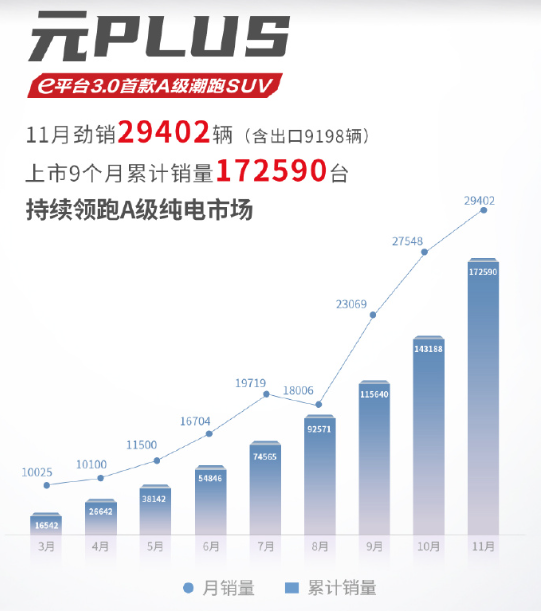 数据显示,元PLUS 11月共卖出29402辆(含出口9198辆),上市9个月销量达172590辆,可以说是比亚迪爆款车型之一。