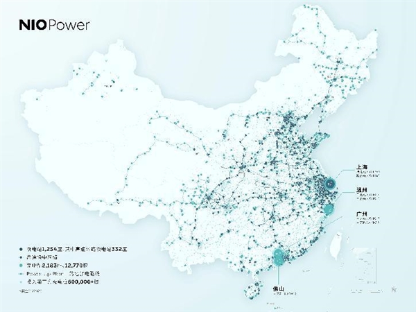 截至12月2日,蔚来已在全国范围内布局换电站1254座,其中高速公路换电站332座,充电站2183座,共计12770根充电桩,接入第三方充电桩600000+根。