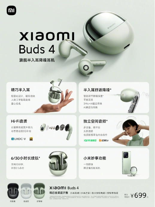 12 月 11 日消息,小米今晚发布了一款少见的半入耳式降噪耳机 —— 小米 Buds 4,首发价 699 元。