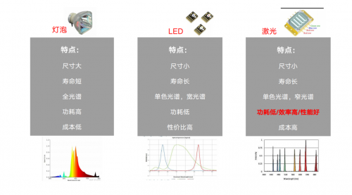 目前市面上,投影仪的主流光源选择有三种,分别是灯泡、LED、激光。传统灯泡的优势是高亮度,但劣势是寿命短、发热大(噪音大),色彩差;LED优势是寿命长,功耗小,劣势则是亮度普遍偏低;激光(三色激光)最大优势是高亮度和超高色域覆盖,作为目前人类唯一能制造出最纯洁的光,三色激光的色域覆盖超越了当下所有民用级显示设备。