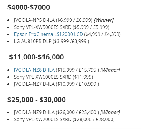 25000到30000美元,入围的有JVC DLA-NZ9 D-ILA 和 索尼VPL-XW7000ES SXRD。