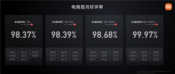 其中,小米12S系列和折叠屏手机小米MIX Fold 2在电商平台的首月好评率,均超过98%。