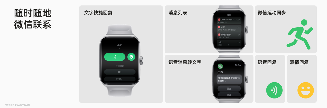 OPPO Watch 3系列将于23年初上线微信手表版,支持文字快捷回复、消息列表、语音消息转文字、表情回复、语音回复等多种功能。此外,冰川灰新品支持全智能模式下5天超长续航、超80款APP适配、独立eSIM,并拥有跨屏导航、电竞模式等丰富的互联功能,带来 “智能与续航兼具“的全方位便捷体验。运动健康方面,不仅有100多种运动模式,还标配ECG心电电极,支持「心电分析提示软件」,为用户提供不间断的健康守护。