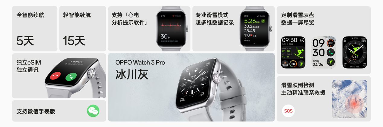12月15日,在OPPO Find N2系列新品发布会上,OPPO Watch 3 Pro全新版本「冰川灰」正式发布。新品浅灰色系颜值开启腕上新视觉,并升级滑雪模式,助力用户释放冬季运动热情。同时,OPPO正式宣布微信手表版即将上线,为用户带来更便捷的腕上体验。