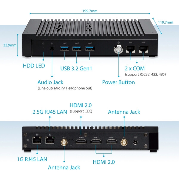 前置I/O有3个USB 3.2 Gen2、2个COM、1个音频口,侧面有2个USB 3.2 Gen1、1个锁孔、一个Intel 2.5G网口,后面预留了3个HDMI 2.0接口、1个Intel千兆网口、2个外接Wi-Fi天线的端孔。