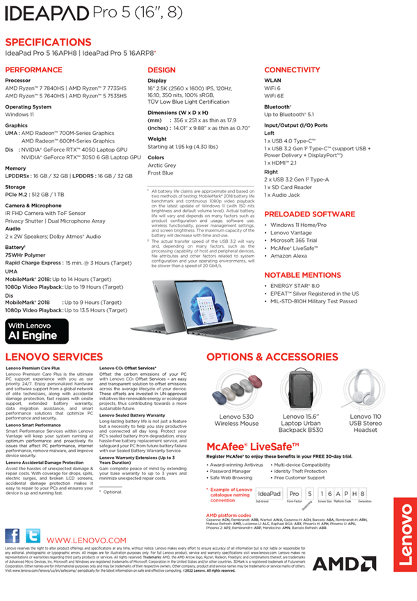 其中,IdeaPad Pro 5 14处理器可选AMD Ryzen 5 7640HS, Ryzen 7 7735HS和Ryzen 7 7840HS,由于AMD尚未正式发布,详细规格有待揭晓,包括CPU/GPU架构信息、主频和核心数量等。